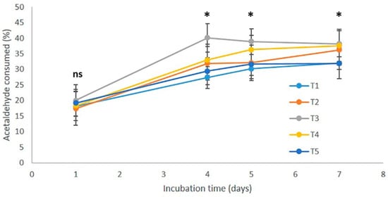 Evolution with time of the consumption of acetaldehyde (in %) by five different red wines (T1, T2, T3, T4 and T5) spiked with 300 mgL−1 of acetaldehyde. Wines were incubated in complete anoxia at 70 °C. Each experimental result is the average of 3 independent replicates. ns: not significant. *: significant differences (p < 0.05) each day.