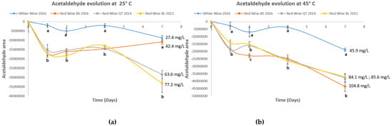 Evolution with time of the levels of acetaldehyde of four different wines spiked with 300 mgL−1 of this compound. Wines were incubated in complete anoxia at 25 °C (a) and 45 °C (b). Each experimental result is the average of 3 independent replicates. Number values indicate the consumed acetaldehyde (mgL−1). Different letters indicate significant differences (p < 0.05) each day.