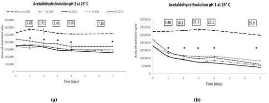 Evolution with time of the levels of acetaldehyde of five pH-adjusted different wines spiked with 35 mgL−1 of this compound. Wines were incubated in complete anoxia at 25 °C. Each experimental result is the average of 3 independent replicates. (a) Evolution in pH2 adjusted wines. (b) Evolution in pH1 adjusted wines. Boxed data, “discriminant index”, defined as the ratio “standard deviation of the means of different wines”/“average standard deviation within replicates”. *: significant differences between the four reds (p < 0.05) each day.