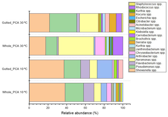 Figure 1 displays bacterial isolates from PCA with genus-level identification. In both sample types, Shewanella isolates were abundant on PCA, and the genus became dominant (up to 38.3%) when incubation at 10 °C was applied. Furthermore, the share of Flavobacterium spp. and Arthrobacter spp. increased when the incubation temperature was lower. The genus Pseudomonas was a major part of both the mesophilic and psychrotrophic populations, with the highest abundance in the gutted herring samples incubated at 30 °C, where it represented 29.0% of all the identified colonies. Members of the genus Aeromonas were frequently isolated, with a higher incidence in the mesophilic population. In the whole herring, Aeromonas dominated at 30 °C, where 37.8% of identified colonies were confirmed as belonging to the genus. Shewanella spp. were most frequently isolated from the Lyngby medium, where they were the main H₂S-producers (Table S2).