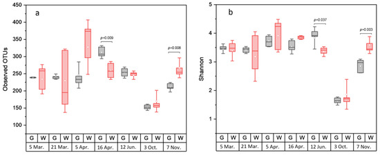 Alpha diversity of bacterial operational taxonomic units (OTUs) in the whole and gutted herring. The number of observed OTUs (a) and the Shannon index (b), attained from sequence data rarefied to 2219 reads. The boxes represent the interquartile range between the first and third quartiles. The horizontal line inside the box is the median and the white circle the mean, with the standard deviation obtained from the 4 to 6 parallel samples of gutted (G) or whole (W) fish. p-value is presented whenever a statistical difference in the mean values between the whole and gutted herring was found.