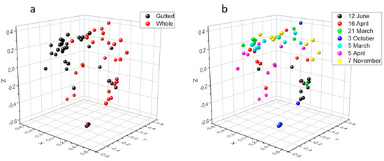 Non-metric multidimensional scaling (NMDS) plot of the OTUs of the whole and gutted herring calculated with the Thetayc distance matrix by the gutting treatment (a) and the sampling date (b), with 97% similarity threshold. The lowest stress is 0.15 and R2 0.86.