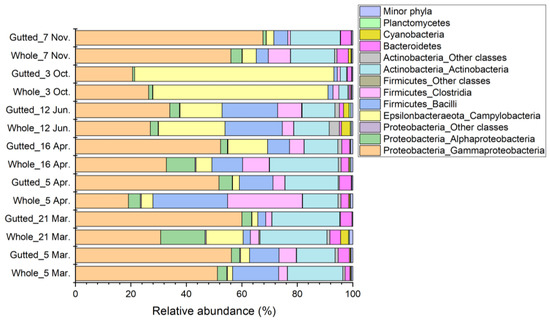 Bacterial population composition of the whole and gutted herring at the class-phylum level as identified with 16S rRNA gene amplicon sequencing. Each batch is an average of four to six whole and gutted fish.