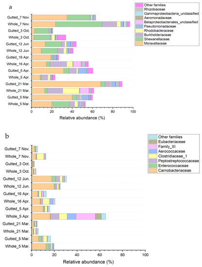 Overall, the relative abundance of the phylum Proteobacteria was higher in the gutted herring compared to the whole herring, as a higher proportion of sequences assigned to the family Moraxellaceae were detected in the samples. Additionally, the phylum Firmicutes was represented with higher relative abundance in the gutted herring samples, except for the fish analysed on 12 June. Nevertheless, major differences between the two sample types were not observed. The 3 October sample batch was surprisingly different from the other batches because of the high relative abundance of the phylum Epsilonbacteraeota. This group refers to a subclass of the phylum Proteobacteria, which currently is named Epsilonproteobacteria [42] but has been proposed to be elevated as a new phylum [43]. The known members of the bacterial group are the pathogenic genera Campylobacter and Helicobacter, as well as an emerging opportunistic food-borne pathogen, Arcobacter [44,45]. The genus Arcobacter is highly abundant in wastewater and has been isolated from coastal waters, seafood (including fish and shellfish), and foodstuff of an animal origin [46,47]. Arcobacter was detected in all the herring samples in the present study, particularly in the 3 October batch, where it was the major group. Since there was only one sample batch in which this genus dominated the whole bacterial community, and no data on water quality are available, it is difficult to draw a certain conclusion. Therefore, more studies are needed on the association between the environmental parameters, water quality, and fish microbial load.