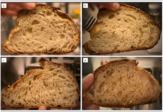 Pictures of the slices of the different breads. (a) BB, bread produced using Bio2 EP; (b) BI, bread produced using ICARDA EP; (c) BG, bread produced using Grossi EP; (d) BBo, bread produced using cv. Bologna.