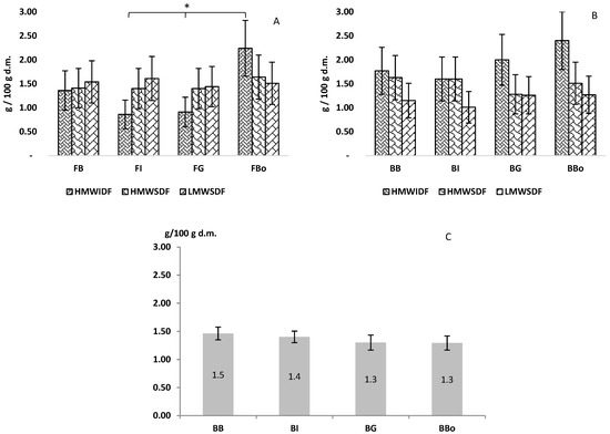 Classes of dietary fibres found in flours (A) and breads (B), together with resistant starch (C) determined in breads. Results are reported as mean ± standard deviation and expressed as g/100 g dry matter. * Indicates a significant difference <alpha> = 0.05. HMWIDF, high molecular weight insoluble dietary fibre; HMWSDF, high molecular weight soluble dietary fibre; LMWSDF, low molecular weight soluble dietary fibre; FB, BIO2 EP Type 1 flour; FI, ICARDA EP Type 1 flour; FG, Grossi EP Type 1 flour; FBo, cv. Bologna Type 1 flour; BB, bread produced using Bio2 EP; BI, bread produced using ICARDA EP; BG, bread produced using Grossi EP; BBo, bread produced using cv. Bologna.