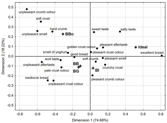 It can be observed that the ideal concept of bread for the panellists matched the “excellent” descriptor (right quadrant), and the breads prepared using EPs flours (BI, BG, BB) were grouped in the lower quadrants of Figure 3, and all intensely associated with sensory attributes of great impact for consumers. More in detail, BI was perceived by judges as having a “pleasant crumb colour”, “crunchy crust”, “soft crumb” and “pleasant smell”, attributes, which all had significant difference (<alpha> = 0.05) following Cochran’s Q test. In addition to previous positive sensory attributes, the judges perceived the presence of an “acid taste” and an “unpleasant aftertaste” for both BG and BB, which are clustered together and therefore closest to the attribute “mediocre bread”. Quality parameters such as bread volume, acidic taste and colour are deeply influenced by the sourdough processing due to enzymatic reactions occurring during fermentation [64]. However, the visual sensory characteristics referred to the crust colour (“unpleasant” and “pale”) did not have a significant difference. On the other hand, the control sample produced with cv. Bologna was visually located distant from the EPs-bread samples. According to CATA data, the bread was found close to “hard crumb”, “unpleasant smell”, “soft crumb” and “unpleasant crumb colour” descriptors, which could be related to the different flour preparation method affecting the sensory characteristics of the finished product [40]. Based on the frequency of the attribute selection, consumers described their ideal bread as having a pleasant crust and crumb colour (74% and 61%, respectively), pleasant smell (76%), golden crust (78%), crunchy crust (96%), soft crumb (87%), pleasant aftertaste (69%), salty taste (61%), and being good (31%) and excellent (63%). When comparing bread samples to the ideal product, no bread directly corresponded to the ideal one, but BI was the closest to it.