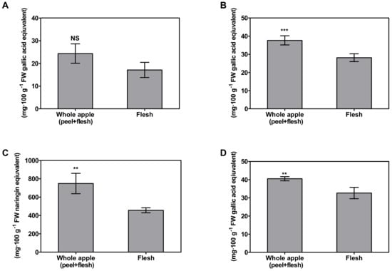 Antioxidant activities and compounds in different antioxidant assays comparing whole apple (peel + flesh) and flesh. NS, asterisk **, and asterisk *** indicate non-significant and significant differences between the peel and the flesh within the same assay, assessed by Student t-test at p > 0.05, p < 0.01, and p < 0.001, respectively. (A): Ferric-reducing antioxidant power; (B): DPPH radical scavenging activity; (C): total flavonoid contents; (D): total phenolic contents.