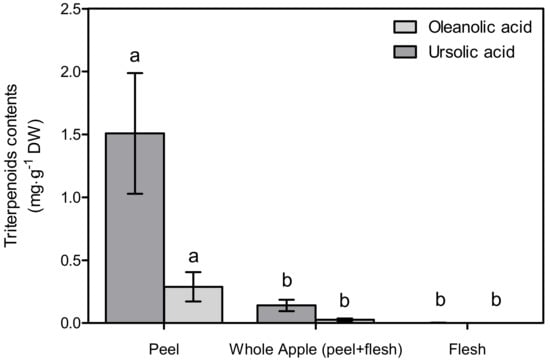 Triterpenoid contents of pre-washed apple peel, whole apple, and flesh. Different letters indicate significant differences (p < 0.05) among the tissues by Tukey’s HSD test (n = 3). Whole apple bioactive contents were calculated per peel and flesh portion.