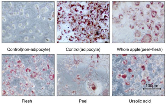 3T3-L1 cell adipocyte images, observed and photographed using a microscope (×400) after cellular lipid accumulation was stained with Oil-Red O solution. The cells were from 70% methanol-treated extracts (1 μg dry powder in 1 mL of DMSO) of peel, flesh, and whole apple (peel + flesh) concentrated samples, or those treated with ursolic acid 5 μM. During the three repetitions of the treatments, a representative photograph was taken.