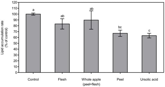 Lipid accumulation rate determined by Oil-Red O assay in 3T3-L1 cells treated with 70% methanol extract (1 μg dry powder in 1 mL of DMSO) from peel, flesh, and whole apple (peel + flesh) samples, or ursolic acid 5 μM-treated samples. The data are represented as % of lipid accumulation compared to control. The bar and error bar indicate mean and standard deviation (n = 3). Different letters indicate significant differences among the groups according to Tukey’s HSD test at p < 0.05.