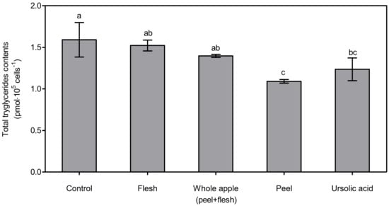 Total triglyceride content determination from 3T3-L1 cells treated with 70% methanol extracts (1 μg dry powder in 1 mL of DMSO) from peel, flesh, and whole apple (peel + flesh) samples or ursolic acid 5 μM treated samples. The data represent the mean and standard deviation (n = 3). Different letters indicate significant differences among the groups according to Tukey’s HSD test at p < 0.05.