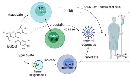 In addition, as an activator of Nrf2, EGCG can inhibit the entry of SARS-CoV-2 into host cells and provide host cells with preparations against SARS-CoV-2 infection [74,75]. Nrf2, the cytoprotective transcription factor, regulates the expression of a wide array of genes involved in antioxidation, detoxification, inflammation, immunity, and antiviral responses [76]. Decreased Nrf2 in differentiated human nasal epithelial cells will increase virus entry and replication, while Nrf2 activators, such as EGCG and sulforaphane, will decrease virus entry and replication [75]. Many studies have also shown that genetic and pharmacological manipulations activating the Nrf2 pathway can inhibit virus replication and prevent virus-induced oxidative damage and inflammation [77]. In addition, by activating Nrf-2 regulated heme oxygenase 1, EGCG can mediate antiviral response by increasing the expression of type 1 interferon and mitigating SARS-CoV-2. At the same time, the inflammatory response is initiated by the interference of Nrf2 and NF-κB in inflammatory tissues, where innate immune cells are recruited (Figure 2) [78,79]. EGCG interferes with SARS-CoV-2 spike-receptor interaction and blocks the entry of pseudotyped-SARS-CoV-2 lentiviral vectors with an IC50 value of 2.5 μg/mL [80]. Studies in silico suggest that EGCG may also inhibit papain-like protease protein and prevent COVID-19 by binding to its S1 ubiquitin binding site. It is shown that EGCG can be used as a broad-spectrum therapy for asymptomatic and symptomatic COVID-19 patients [81].