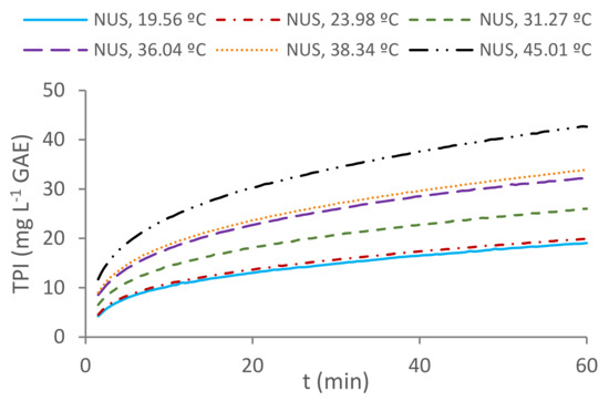 In relation with the temperature of the extraction media, higher extraction curves are obtained as the solvent’s temperature is increased. In fact, the TPI obtained after 60 min at 45.01 °C was 42.659 ± 0.469 mg·L