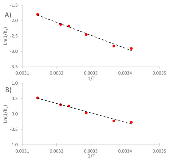 As it was explained by Arrhenius in 1889, kinetic constants vary with the temperature of the system following the empiric formula shown in Equation (5) [