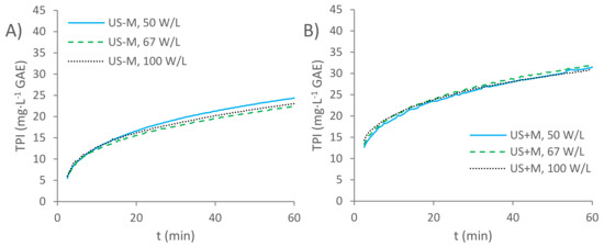 −1 GAE). Therefore, the extraction of phenols at the beginning of the extraction procedure seems to increase as the ultrasound power level is also increased. On the other hand, the final TPI values follow a different trend: the highest TPI value after completing the extraction process was obtained for the extraction that was carried out at 67 W·L