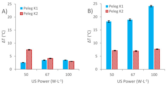 With regard to K1, the increments of the temperature generated by the sonication of the extraction media show an increasing tendency as the ultrasound power level is increased. Thus, for 50 W·L−1, the temperature at which the non-sonicated extraction should have been carried to obtain the same initial rate is 18.24 ± 0.31 °C higher than the actual one. For 67 W·L−1, this increment is 18.9 ± 0.33 °C, and for 100 W·L−1 it is 24.11 ± 0.29 °C.