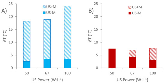 Figure 4A,B), and the temperature increments caused by the sonication of the extraction media are plotted in