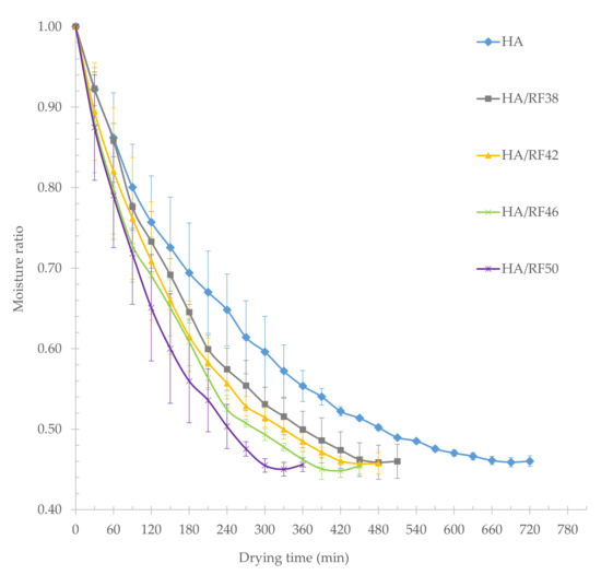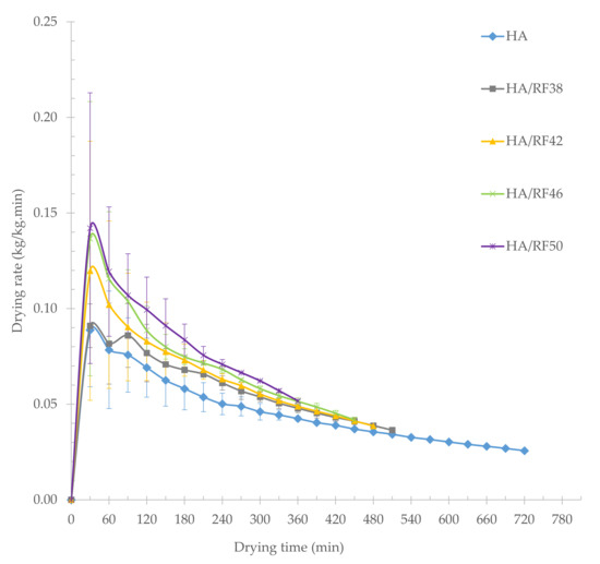 At a final moisture content of 14%, drying paddy at HA, HA/RF38, HA/RF42, HA/RF46, and HA/RF50 took about 720, 510, 480, 450, and 360 min, respectively. Compared with HA drying time as the baseline value, the savings of drying time were 29.17%, 33.33%, 37.50%, and 50.00%, respectively. As a result, the drying time required for combined drying with HA/RF was advantageously shorter than that required for drying with HA. In all treatments, it was found that drying time was shortened when RF heating temperature increased because, in the early drying stage, the moisture content of fresh paddy was 25–26% (w.b.). The high water content in the paddy absorbed more energy at different moisture contents due to the dielectric properties of paddy seed in different moisture contents [2], and free water with high water activity accounted for most of the water content in the paddy at this early stage. The transfer and accumulation of heat accelerated the evaporation of free water in the paddy. This may indicate that the drying rate depends on the radiation intensity, which was exerted by the RF heating temperature in this study, and that the drying time was shortened with increasing radiation intensity [26,27].