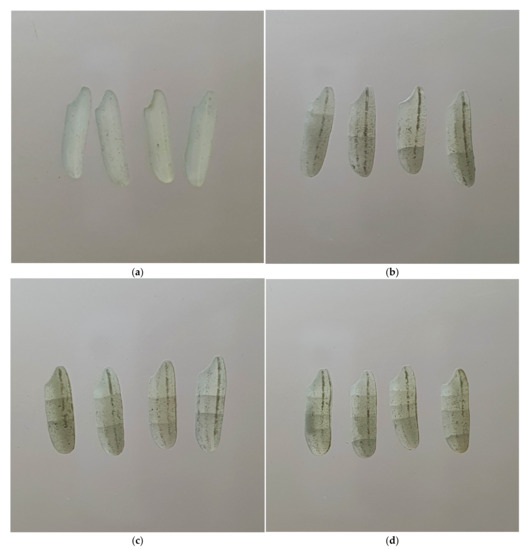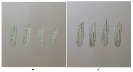 The effects of different RF heating temperatures on the fissure percentage of brown rice with different fissure degrees are shown in Table 3. The fissure percentage was classified into four groups, namely None (0 fissure), Few (1–2 fissures), Moderate (3–4 fissures), and Severe (≥5 fissures), as reported by [31]. The morphology of fissures in white rice with different fissure degrees is shown in Figure 4. The fissure percentage of brown rice kernels with “None” fissure degree was significantly decreased from 99.78% ± 0.44% to 85.33% ± 1.87% from HA to HA/RF50. In contrast, the fissure percentages of brown rice kernels with “Few”, “Moderate”, and “Severe” fissure degrees were significantly increased from 0.33% ± 0.50% to 12.44% ± 1.81%, 0.00% to 0.56% ± 0.73%, and 0.00% to 1.78% ± 0.83% from HA to HA/RF50, respectively. The “None” fissure degree considered the most important characteristic, while the “Severe”, “Moderate”, and “Few” fissure degrees considered the most undesirable characteristic, respectively, because fewer fissure kernels would result in a high head rice yield of milled rice. This result showed that RF heating significantly affected the fissure percentage due to the high absorption of RF energy inside the rice kernels [31] and that the temperature of the rice grain plays an important role in the development of a heat and moisture gradient inside the grain, resulting in surface hardening [32] and differential stress [33], respectively. The optimum condition for RF heating temperature was HA/RF42, as no “Moderate” and “Severe” fissure degrees were observed. Referring to the earlier study by Chitsuthipakorn and Thanapornpoonpong [12], drying paddy with hot air combined with RF heating temperatures of 45 °C, 50 °C, 55 °C, and 60 °C showed that the critical limit of RF heating temperature was HA/RF45 because the least “Moderate” and “Severe” fissure degrees were observed. Moreover, the fissure percentage result was relatively lower in this study because of the modification of the prototype machine, as mentioned in the Introduction.