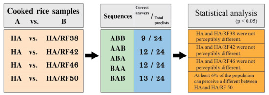 A triangle test was conducted to determine whether panelists were able to distinguish cooked rice dried with hot air (control) from cooked rice dried with hot air combined with RF heating, as shown in Figure 5. It was found that cooked rice dried with HA/RF50 was significantly different from HA, and at least 6% of the population was able to perceive a difference. The proportion of the population able to perceive a difference between samples of cooked rice was calculated using a one-sided lower confidence interval, as shown in Equations (17)–(20):