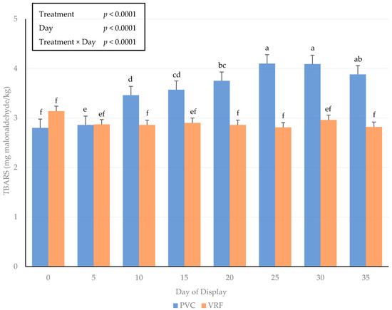 There was an interactive effect of the packaging method × day of display for lipid oxidation on fresh beef steaks (Figure 1). The packaging method did not alter (p > 0.05) lipid oxidation through day 5 of the simulated retail display period. However, from days 10 through 35 of the storage period, lipid oxidation was greater (p < 0.05) for steaks packaged using PVC methods. Lipid oxidation of fresh steaks using PVC packaging from the current study agrees with previous simulated retail storage studies measuring an expected storage period in a retail setting of 3 to 7 days [32]. The exposure to greater amounts of oxygen across the packaging material can result in increased catalysis of lipid oxidation [33,34]. Moreover, greater lipid oxidation can be correlated to reduced consumer palatability due to the deterioration of the surface color and accumulation of off flavors [35]. Unfortunately, the evaluation of sensory taste characteristics was not completed during the current study, but future studies on the extended storage of fresh beef influencing lipid oxidation and sensory characteristics would be warranted.