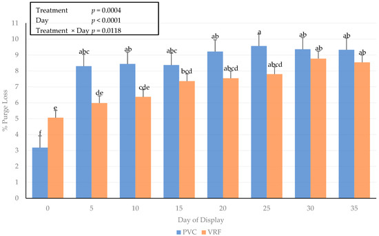 A packaging method × day of display interaction occurred for the purge loss of fresh beef steaks (Figure 2). The purge loss was greatest (p < 0.05) for steaks packaged in PVC materials on day 25 of the simulated display period and the lowest on day 0. The packaging method influenced the purge loss on day 0, with steaks packaged in VRF having a greater (p < 0.05) percentage of moisture loss. It is plausible that the method of vacuum packaging using the form-and-fill machine caused more moisture to be pressed out of the steak at the time of package sealing. However, the purge loss in vacuum-packaged meat products can result in an unappealing visual appearance for consumers due to the accumulation of purge in the packaging [36,37]. The results from the current study differ from previous results where values for purge loss using vacuum-packaging platforms were greater than PVC or alternative packaging such as modified atmosphere packaging platforms [38].
