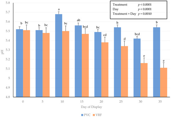 The interactive influence of the packaging method × day of display for fresh muscle pH values is presented in Figure 3. Fresh muscle pH values were recorded within muscle pH values (5.1 to 5.8) throughout the duration of the simulated display period. Values for fresh muscle pH were greatest (p < 0.05) on day 10 in steaks packaged using PVC methods. At the time of harvest and before chilling, carcasses were rinsed with an FDA-GRAS (U.S. Food and Drug Administration-Generally Recognized as Safe) organic acid (lactic acid). The combination of vacuum packaging and the organic carcass wash may have contributed to the decline in fresh muscle pH of VRF-packaged steaks, causing a shift in the visual and instrumental surface color variations reported within the current study. Furthermore, it is plausible that pH values for VRF declined due to an increase in lactic acid bacteria that can be present in vacuum-packaged fresh meats. With limited residual oxygen within the vacuum package, favorable conditions for anerobic lactic acid bacteria may have caused fresh muscle pH to decline as lactic acid bacteria populations increased [5,39]. In addition, lactic acid bacteria can be associated with low-pH (<5.8) vacuum-packaged meats due to a lower residual oxygen environment [40].