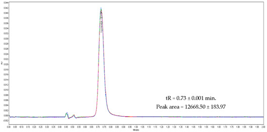 Specificity of the developed method obtained using six injections of a standard stock solution containing 40 µg/mL yielded mean tR values of 0.73 ± 0.001 min. The peak area of 12668.5 ± 183.97 (Figure 2) clearly depicted that the developed method was a good measure for detecting lycopene in the injected sample. A standard curve was assayed over a concentration range of 10 to 100 µg/mL for validation of the linearity method. Data on the correlation between peak areas versus lycopene concentrations were statistically processed by the linear least squares regression analysis method, which resulted in an acceptable correlation coefficient of 0.998 (Figure 3). Moreover, the maximum deviation between the actual concentrations injected, and the concentrations recovered were within ±2.5%. The recovery was performed by spiking a blank supplement sample with lycopene at five levels of concentration with six replications for each concentration (Table 3). Satisfactory recoveries between 97.38% and 102.67% with RSD values lower than 2.5% were achieved.