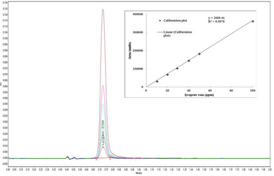 The limit of detection (LOD) was considered the lowest standard concentration in the analytical run, and it afforded accuracy and precision of at least 20%. In this method, it was 0.14 µg/100 mL. The limit of quantification (LOQ) was calculated as 0.37 µg/100 mL. It showed that the developed method has an effective LOD and LOQ for the lycopene in food matrices.