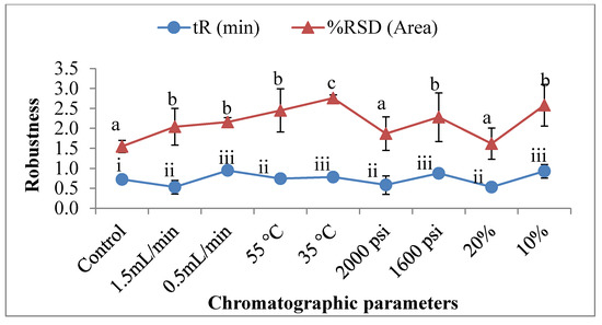 The variation in the system suitability with respect to the robustness parameters (tR and percentage (%) RSD of the area). Control parameters (flow rate—1 mL/min; column temperature—45 °C; ABPR—1800 psi; and modifier concentration—15%). (Values with different letters in the same graph are significantly different with p < 0.05).