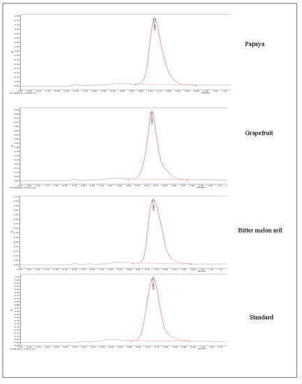The developed method was used to quantify lycopene content from papaya, grapefruit, and ripe bitter melon aril. Figure 5 shows the UPSFC spectra of the respective samples, including standard lycopene at 0.72 min. The lycopene content in the fresh papaya, grapefruit, and aril was 14 ± 1.28, 9.8 ± 0.63, and 215 ± 4.83 mg/100 g. The developed UPSFC-DAD method had good recovery of 100.32%, LOD of 0.14 µg/100 mL, and LOQ of 0.37 µg/100 mL (Table 5). Satish et al. [16] have developed an HPLC method for the quantification of lycopene. It reported a retention period of 14.2 min. However, recently, Figueira et al. [49] have developed a quick UHPLC-PDA method for quantifying lycopene that reduced the tR to 2.0 min from a total run period of 4.5 min. The technique illustrated that UHPLC-PDA could be a reliable and effective method for determining lycopene, although using the 100% organic solvents is a significant concern. Developed UPSFC-DAD methods provide lycopene capability within 1 min with 80% less organic solvent consumption since 80% of the mobile phase is CO2.