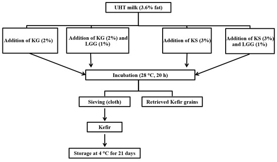 Before the kefir preparation, Lacticaseibacillus rhamnosus GG strain (LGG; ATCC 53103) [27] was cultured in de Man, Rogosa, Sharpe (MRS; Oxoid, Basingstok, Hampshire, UK) medium at 37 °C for 24 h under anaerobic conditions. Following incubation, 50 μL of probiotic culture was sub-cultured in plastic tubes containing 50 mL of MRS broth, which were incubated at 37 °C overnight under anaerobic conditions. Next, the probiotic culture biomass was harvested by centrifugation at 4000× g for 10 min at 20 °C, and washed twice with sterilized standard saline solution. Finally, the harvested cells were resuspended in 10 mL of UHT milk and used as a LGG culture to produce kefirs. Four different kefir batches were prepared: KG (kefir produced from kefir grains), KG-LGG (kefir made from kefir grains, with the addition of LGG), KS (kefir produced from natural kefir starter culture), and KS-LGG (kefir produced from natural kefir starter culture, with the addition of LGG). All batches were incubated at 28 °C for 20 h (Figure 1). Kefir samples containing the LGG strain were prepared using 1% probiotic LGG with 2% KG and 3% KS. All samples were filtered by a cloth sieve to filter out the grains. After kefir production, the samples were kept for 21 days at 4 °C. Probiotic viability and physicochemical properties were analyzed after 1, 7, 14, and 21 days of storage.