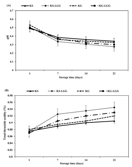 The pH values of the kefir samples were measured after 1, 7, 14, and 21 days of storage at 4 °C. The index of pH of all kefir samples ranged between 4.49 and 4.53 on day 1; these values decreased throughout the storage period, as also reported in other fermented milk products such as yoghurt [31,32]. pH values of KG varied from 4.53 to 4.32, and from 4.49 to 4.34 in KS throughout the duration of storage time (Figure 2A). These values were higher than those reported by Kök–Taş et al. [11], who noted pH values of 4.47–4.29 for KG, and 4.50–4.37 for KS during 21 days of storage at 4 °C.