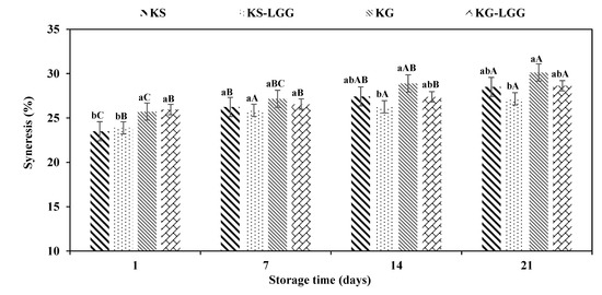 Syneresis (%) of different formulations of kefir during storage at 4 °C. KG = kefir produced from kefir grains, KG-LGG = kefir produced from kefir grains containing LGG, KS = kefir produced from natural kefir starter culture, and KS-LGG = kefir produced from natural kefir starter culture containing LGG. Lowercase letters indicate significant differences (p < 0.05) between samples at the same storage timepoint; uppercase letters indicate significant differences (p < 0.05) between the storage days of each kefir sample. Error bars represent the mean (n = 3) ± standard deviation (SD).