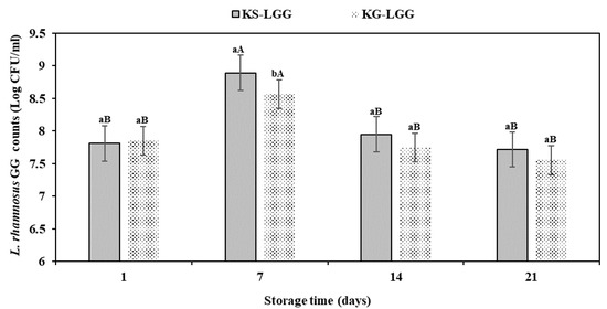 After 7 days of storage, LGG counts gradually declined until 21 days of storage (p < 0.05), where the LGG final counts in KS-LGG and KG-LGG samples reached 7.71 and 7.55 log cfu/mL, respectively (Figure 4). On days 14 and 21 of storage, LGG counts were similar between KS-LGG and KG-LGG samples (p > 0.05). It is assumed that pH decline and post-acidification during storage of kefir samples (Figure 2) may lead to an adverse effect on the survival rate of probiotic bacteria [7,31].