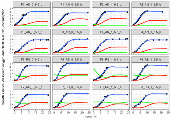 Growth kinetics of Leuconostoc mesenteroides E30. The conditions of each fermentation (F1 to F8) are detailed in Table 1. X-axis, time (hours) of incubation; Y-axis, growth (lnX/X0), dissolved oxygen (dO2%), and NaOH:NaHCO3 (meq/L) consumption; black symbols, biomass production; blue line, kinetics of growth (ln X/X0) estimated with the model of Baranyi and Roberts [27] where X and X0 are, respectively, the biomass measured at each withdrawal time and at start of fermentation; green line, dO2% measured through polarographic electrode; red line, milliequivalents/L (meq/L) of NaOH:NaHCO3 consumed during fermentation. Code of fermentation name: AN, anaerobiosis; RS, respiration; 0, absence of sodium citrate in mWMB; 1, supplementation of mWMB with 5 g/L of sodium citrate; 5.5, pH controlled at 5.5; 6.5, pH controlled at 6.5.