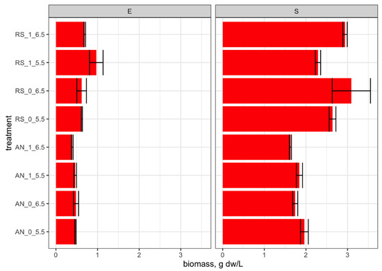 The kinetics of growth of Leuc. mesenteroides E30 was evaluated at different growth conditions (AN vs. RS), carbon source (glucose vs. citrate), and pH values (5.5 vs. 6.5) (Figure 1). The dynamic model of Baranyi and Roberts [27], used to estimate the growth parameters (Table 2), provided a good fit for all cultivations (R2 from 0.998 to 0.972).