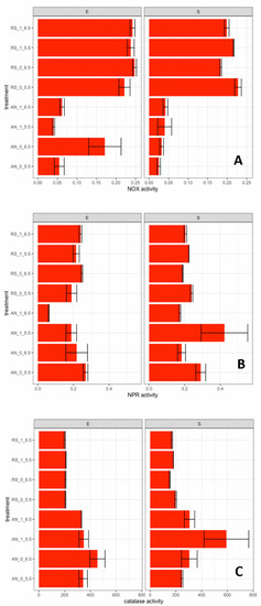 Enzymatic activity of NADH oxidase (NOX, (A)), NADH peroxidase (NPR, (B)), and catalase (CAT, (C)), respectively, expressed in µkatal/mg protein. Growth conditions: RS, respiratory growth (with 15% dissolved oxygen (dO2%), supplementation with 1.25 μg/mL of hemin and 1 μg/mL of menaquinone); AN, anaerobic growth (with nitrogen flow at 0.02 L/min). Conditions of each fermentation (F1 to F8) are detailed in Table 1. Code of fermentation name: AN, anaerobiosis; RS, respiration; 0, absence of sodium citrate in mWMB; 1, supplementation of sodium citrate (5 g/L) in mWMB; 5.5, controlled pH at 5.5; 6.5, pH controlled at 6.5. Growth phase: E, exponential phase; S, stationary phase. Mean values and standard errors are reported.