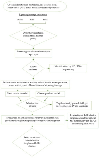 Many traditional RTE fermented foods constitute rich ecological niches for screening LAB with anti-L. monocytogenes activity [13,14,15]. The selection of LAB with anti-L. monocytogenes activity from these products to be used as protective cultures should be performed from strains adapted to the ecological niche of these products since they must survive and are competitive in conditions of processing and/or storage. Thus, LAB strains should be isolated during ripening and/or storage conditions of meat and dairy-ripened products following different steps (Figure 1). First, LAB isolate should be obtained from meat and dairy-ripened products, testing different days of ripening (for example initial, half, and final time) or in different days of storage, with the purpose to obtain strains adapted to characteristics and processing conditions of the chosen foods. Then, isolated strains should be preliminary characterized by Gram staining, catalase reaction, shape by microscopic observation of overnight cultures, and biochemical features, as it has been reported in LAB strains isolation from soft cheese [16,17] or dry-cured fermented sausages [18]. After the first preliminary characterization, the isolates are screened for anti-L. monocytogenes in culture media usually by the agar spot-on-a-lawn method [14,19]. Thus, preliminary active isolates against L. monocytogenes are obtained, which are characterized by 16S rRNA sequencing [17] and further evaluated by co-inoculation with L. monocytogenes for anti-listerial activity in food models simulating temperature, water activity, and pH conditions of RTE products, as it has been reported by Martín et al. (Unpublished data) in soft cheese model for the selection of active anti-listerial LAB strains (Figure 1). This step is of the utmost importance to discard LAB strains lacking activity or with low activity in the processing or storage conditions of RTE foods. Thus, active LAB strains against L. monocytogenes able to be finally evaluated in RTE products are selected. In parallel, the selected LAB strains should be finally characterized by some additional method to the 16 rRNA sequencing, which allow the differentiation at strain level. This should be of great value to evaluate implantation of selected strains in RTE foods in the next step. Pulsed-field gel electrophoresis analysis (PFGE) has been reported as an appropriate method for the differentiation of LAB strains [20]. In addition, the RFLP analysis of the tuf gene has also been described as a suitable tool for the differentiation of LAB strains [21].