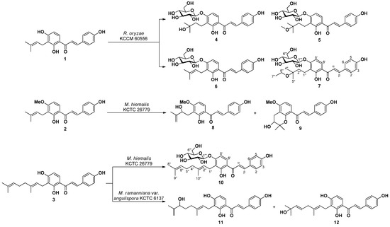 Microbial transformation of three bioactive prenylchalcones 1–3 is reported herein. Fermentation of 1 with R. oryzae KCCM 60,556 furnished three new (4, 5, and 7) and one known (6) metabolites. Fermentation of 2 with M. hiemalis KCTC 26,779 furnished two known (8 and 9) metabolites. Fermentation of 3 with M. hiemalis KCTC 26,779 furnished one new (10) metabolite, while that with M. ramanniana var. angulispora KCTC 6137 resulted in the production of two known (11 and 12) metabolites (Figure 1) (Figures S8–S41).