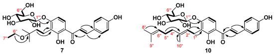 The molecular formula of compound 7 was determined as C28H36O10 using HRESIMS on the basis of a molecular ion at m/z 555.2208 [M+Na]+ (calcd. for C28H36O10Na,555.2206), which corresponded to 11 degrees of unsaturation. The NMR data of 7 were almost identical to those observed for 4 except for the appearance of one O-methylene (δH 3.55, 2H, q, J = 7.0 Hz/δC 58.0) and one methyl (δH 1.21, 3H, t, J = 7.0 Hz/δC 16.5) signals corresponding to H-6′’ and H-7′’, readily attributable to an ethyloxy group. Further evidence was obtained from the obvious correlation between proton signals H-6′′ and H-7′′ (Figure 2) in the 1H-1H homonuclear correlation spectroscopy (COSY) experiment. HMBC correlation between H-6′’ and C-3′’ confirmed the location of the ethyloxy group at C-3′’. Accordingly, the structure of 7 was assigned 3′-(3-O-ethyl-3-methylbutyl)-4′-O-β-d-glucopyranosyl-4,2′-dihydroxychalcone.