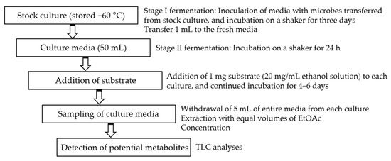 Initial fermentations were performed in 50 mL media. A two-stage fermentation method was employed in all experiments [26]. After inoculation and continued incubation for 24 h, the solution of each substrate (1–3) in ethanol (20 mg/mL) was distributed to each flask. The concentration of each substrate in the media was 0.02 mg/mL. Incubation was further continued for 4–6 days. The two parallel controls were conducted under the same conditions, i.e., substrate controls (substrate in microorganism-free culture media) and culture controls (microorganisms in substrate-free culture media). Substrate-containing microbial media were sampled by withdrawing 5 mL of entire media at every two days after addition of substrate. They were extracted with equal volumes of EtOAc. The organic layers were concentrated and spotted on thin layer chromatography (TLC) plates, and developed with chloroform/methanol (6:1). After spraying anisaldehyde-sulfuric acid reagent, the TLC plates were heated over 100 °C for detection of potential metabolites (Scheme 1).