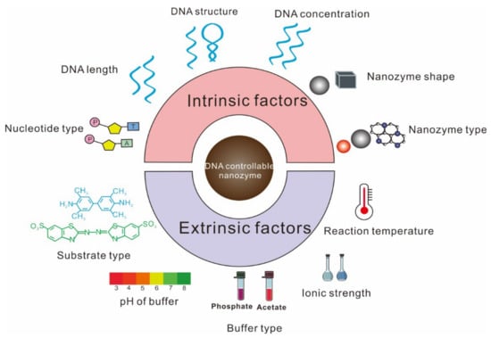 The influence of ssDNA on nanozyme activity is complicated. Initially, many research works reported that nanozyme activity was inhibited by ssDNA. As research continued, some groups demonstrated that ssDNA actually improved nanozyme activity [33]. The reasons are yet unclear, but the type of nanozyme and DNA, buffer condition, and temperature in the reaction system were found to be different in these contradicting studies. Hence, to achieve an accurate design of ssDNA-controllable nanozyme biosensors, it is requisite to clearly understand the influence of diverse factors, including intrinsic and extrinsic ones, on the regulation of nanozyme activity by ssDNA (Figure 1).