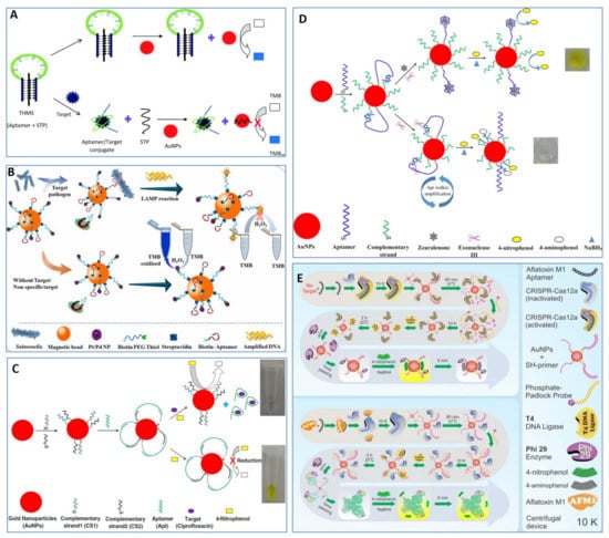- Abnous, K.; Danesh, N.M.; Ramezani, M.; Alibolandi, M.; Nameghi, M.A.; Zavvar, T.S.; Taghdisi, S.M. A novel colorimetric aptasensor for ultrasensitive detection of aflatoxin M-1 based on the combination of CRISPR-Cas12a, rolling circle amplification and catalytic activity of gold nanoparticles. Anal. Chim. Acta 2021, 1165, 338549. [Google Scholar] [CrossRef]