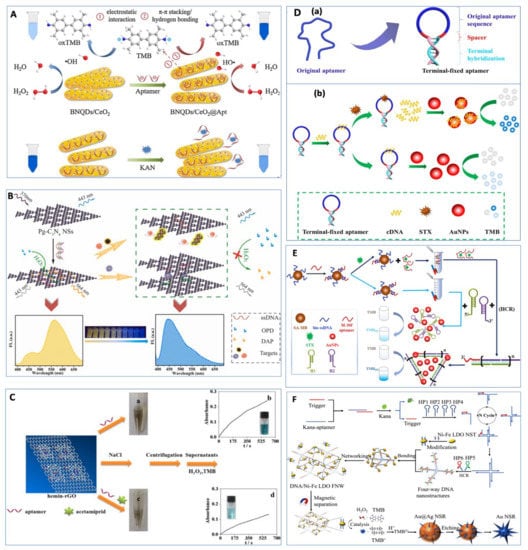 Aside from those mentioned above, various aptasensor strategies based on the enhancement of nanozyme activity by ssDNA have been proposed. Zhu et al. [56] used aptamers to enhance the peroxidase-like activity of boron nitride quantum dots-anchored porous CeO2 nanorods (BNQDs/CeO2) to achieve 4.6 pM kanamycin detection (Figure 3A). The BNQDs/CeO2 nanozymes showed peroxidase-like activity, while integrating BNQDs/CeO2 nanozymes with kanamycin aptamers demonstrated obviously enhanced catalytic activity. However, the presence of kanamycin could inhibit such catalytic enhancement due to the specific binding between aptamer and kanamycin. Thus, the detection signal was negatively correlated with the concentration of the target. Similar mechanisms were also applied for the detection of tetracycline [85], kanamycin [57], sulfadimethoxine [86], cocaine [87], abrin [88], malachite green [89], and Streptococcus pneumoniae [90]. In addition, Wang et al. [50] developed a versatile ratiometric fluorescence platform for detecting Hg(II) and aflatoxin B1 (AFB1) based on the enhancement of peroxidase-like activity of Pg-C3N4 nanosheets by ssDNA. As shown in Figure 3B, Pg-C3N4 nanosheets had a maximum fluorescence emission of 443 nm under excitation at 370 nm. Subsequent adsorption of aptamer onto the surface of Pg-C3N4 nanosheets did not change the fluorescence intensity but greatly improved their peroxidase-like activity. The high peroxidase-like activity of aptamer/Pg-C3N4 complexes could accelerate the catalysis reaction between o-phenylenediamine (OPD) and H2O2 to produce more 2,3-diaminophenazine (DAP), which quenched the fluorescence of aptamer/Pg-C3N4 complexes at 443 nm and generated a new emission peak at 564 nm. However, the presence of target molecules induced the dissociation of aptamers from Pg-C3N4 nanosheets, resulting in low peroxidase-like activity of the Pg-C3N4 nanosheets. Then, the fluorescence intensity increased at 443 nm, and the fluorescence intensity decreased at 564 nm. By measuring the change in the fluorescence intensity ratio (I443/I564), the versatile ratiometric fluorescence platform achieved 0.01 nM Hg(II) and a 0.01 pg/mL AFB1 detection limit using AFB1 aptamer. Yang et al. [91] developed a facile label-free colorimetric aptasensor for acetamiprid detection based on the peroxidase-like activity of hemin-functionalized reduced graphene oxide (hemin-rGO) (Figure 3C). Aptamers adsorbed onto the surface of hemin-rGO had an ability to increase the individual hemin-rGO electrostatic repulsion and hinder the coagulation of hemin-rGO in the presence of salt. Thereafter, all hemin-rGO in the supernatant catalyzed TMB in the presence of H2O2 to produce a blue color. However, the presence of acetamiprid led to the formation of acetamiprid–aptamer complexes, preventing the aptamers from adsorbing onto hemin-rGO. Therefore, hemin-rGO aggregated under salt stress conditions, and little hemin-rGO remained in the supernatant after centrifugation. Thus, the color of the supernatant did not change. Under optimized conditions, the LOD reached 40 nM. Similar methods were reported to detect bisphenol A using hemin-rGO nanozymes [92], as well as Hg(II) and Pb (II) using the peroxidase-like activity of GO–AuNP nanohybrids [93]. Moreover, RNA aptamers were also found preventing the hexadecyltrimethyl ammonium bromide (CTAB)-induced aggregation of AuNPs and improving the peroxidase-like activity of AuNPs. Utilizing this characteristic, a colorimetric aptasensor based on the inhibition of the peroxidase-like activity of AuNPs by CTAB was developed for the detection of malachite green, with a LOD of 1.8 nM [94].