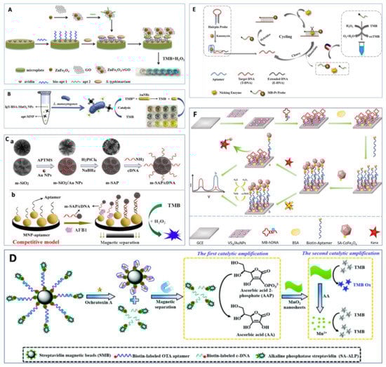 - Wu, L.; Zhou, M.; Wang, Y.; Liu, J. Nanozyme and aptamer-based immunosorbent assay for aflatoxin B1. J. Hazard. Mater. 2020, 399, 123154. [Google Scholar] [CrossRef]