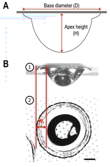 (A) Definition of the base diameter (D) and apex height (H) in drying WPI/NPC droplets. (B) Foot width (wf) observed by profile visualization ➀ and top view ➁ at the end of the evaporation in a WPI droplet. Scale bar equal to 200 µm.