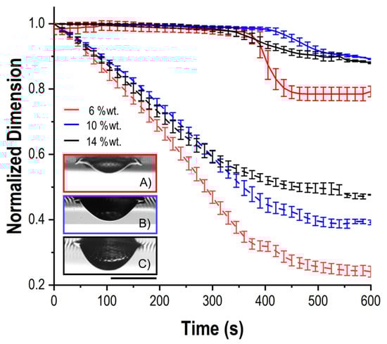 The systematic analysis of D and H by profile observation provided indirect evidence of the impact of the sample characteristics (cp, WPI%R) on the droplet morphology changes induced by the evaporation, here quantified by the diameter reduction and the final apex height. In Figure 2, the evolution of D (solid line) and H (dashed line) normalized by their maximum values (Dmax, Hmax) is displayed, as a reference, for WPI suspensions (WPI%R = 100%) with different cp, as in these samples, the shape modifications are more evident than in other mixes. For the sake of clarity, only the data related to cp = 6 wt%, 10 wt% and 14 wt% are shown. As it concerns the D/Dmax curves, a transition from border detachment (Figure 2A) to slight shrinkage (Figure 2B), similar for all WPI droplets when cp ≥ 10 wt%, was observed with increasing the initial protein content in the suspensions. The attenuation of the delamination at a higher cp could be explained by the enhanced accumulation of solutes driven by drying-induced outward capillary flows [26,27]. This would lead to the formation of a larger external “foot” able to withstand the surface inward stresses due to its structural robustness and possibly even its improved chemical affinity with the substrate. Indeed, in the Materials and Methods section, the respective protein content has been reported for the WPI and NPC powders used for the sample preparation. This means that these commercial powders contained a minor amount (5–6 wt%) of the other protein, as well as of lactose and minerals. In previous studies, NPC colloids have been proven to favor the triple line adhesion in drying droplets, resulting in negligible border detachment [15]. Therefore, it is likely that, for cp ≥ 10 wt%, WPI dispersions include enough casein micelles contributing to the foot anchoring to the PDMS surface. On the other hand, increasing cp also corresponded to a gradually higher final apex height. Such a behavior could be interpreted in the light of the probable earlier achievement of the surface sol−gel transition conditions, i.e., for a WPI critical concentration cgel = 41 wt%, resulting in the development of a thicker skin layer [9].
