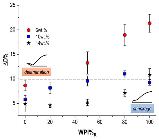 For the sake of clarity, the ΔD% values related to all the explored WPI/NPC mixes are reported in Table 2, whereas in Figure 3 only the outcomes for suspensions with cp = 6 wt%, 10 wt%, and 14 wt% are displayed. The outcomes highlighted that an increasing amount of whey proteins in the binary mix corresponded to a more significant diameter reduction, resulting in delamination (ΔD% ≥ 10%) under certain conditions (cp ≤ 8 wt%). This is not surprising, as numerous works in the literature have shown that, contrary to what already mentioned for NPC, the brittle character of WPI-rich dry structures fosters border delamination [9,12]. However, the increase in the overall protein concentration produced strong mitigation of the diameter reduction, until a ΔD% < 10% for cp ≥ 10 wt% regardless of WPI%R. This corroborates the hypotheses of a possible thicker foot width and enhanced adhesivity with increasing cp.